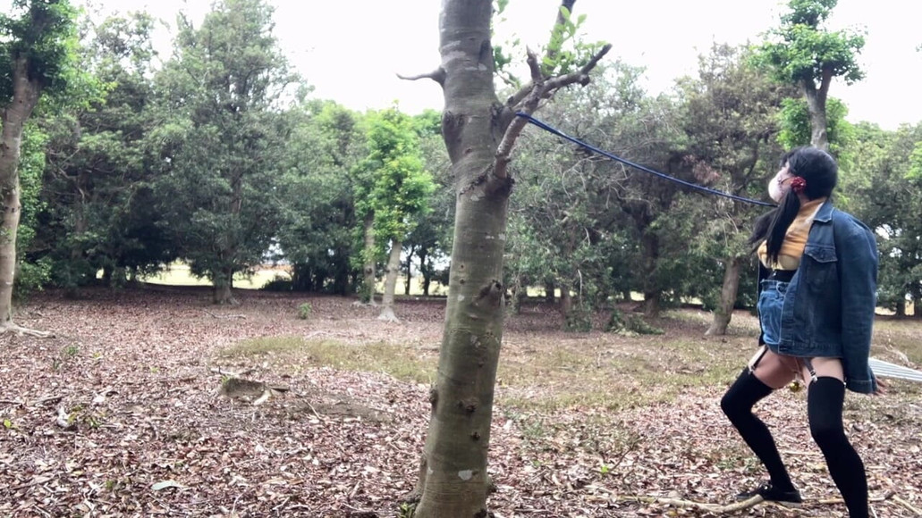 When you lift up a tight skirt, your tuck pussy is exposed right away. You take an exposure walk in that state. Lifting up your sweater reveals your bra, completing the bra show. You flaunt your perverted side by displaying your exposed tuck pussy and even lifting one leg to show off your exposed tuck pussy. When taking breaks, you tie the leash to something before resting.