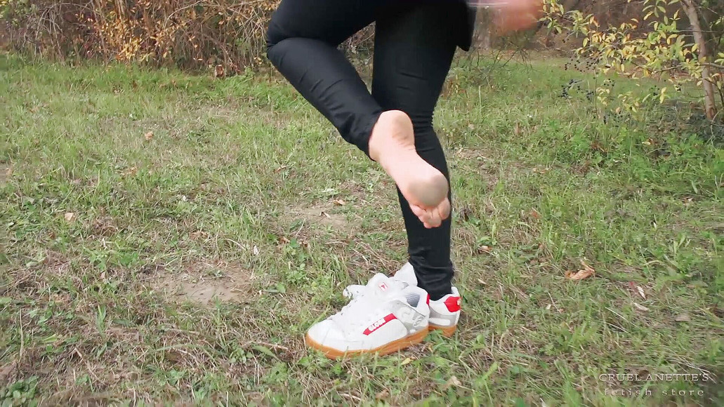 Mistress Anette went out for a little walk in the wood in the morning and she had a great idea to humiliate her slave. She pulled down her sneakers and socks and she smeared her naked soles in the sand, until they were dirty. Then she went back home and she ordered her slave to clean her almost black soles with his tongue and if he hesitates, there will be consequences.