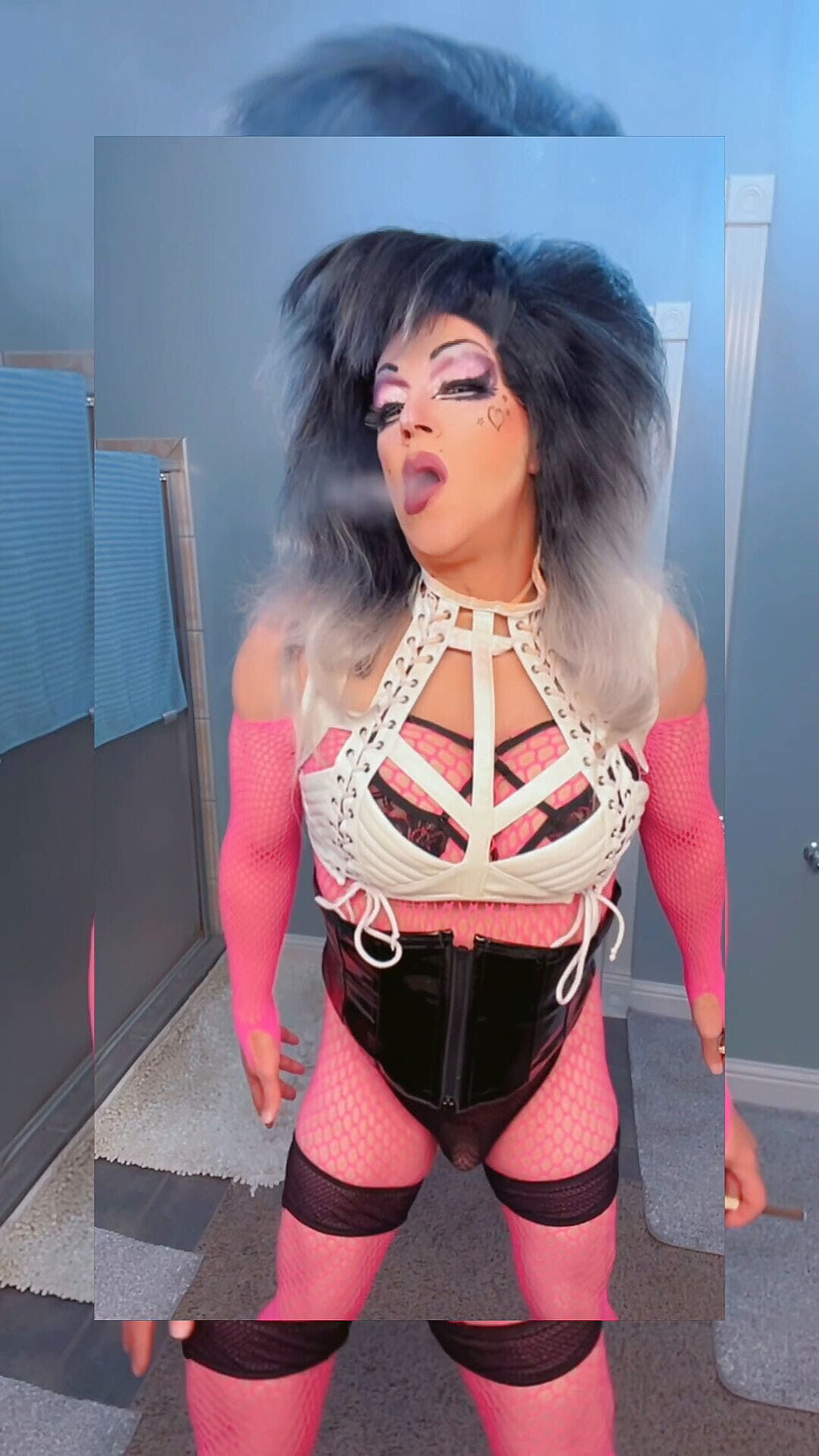 Shelly Roberts sucking dildo smoking vaping crossdresser big hair fetish dildo suck